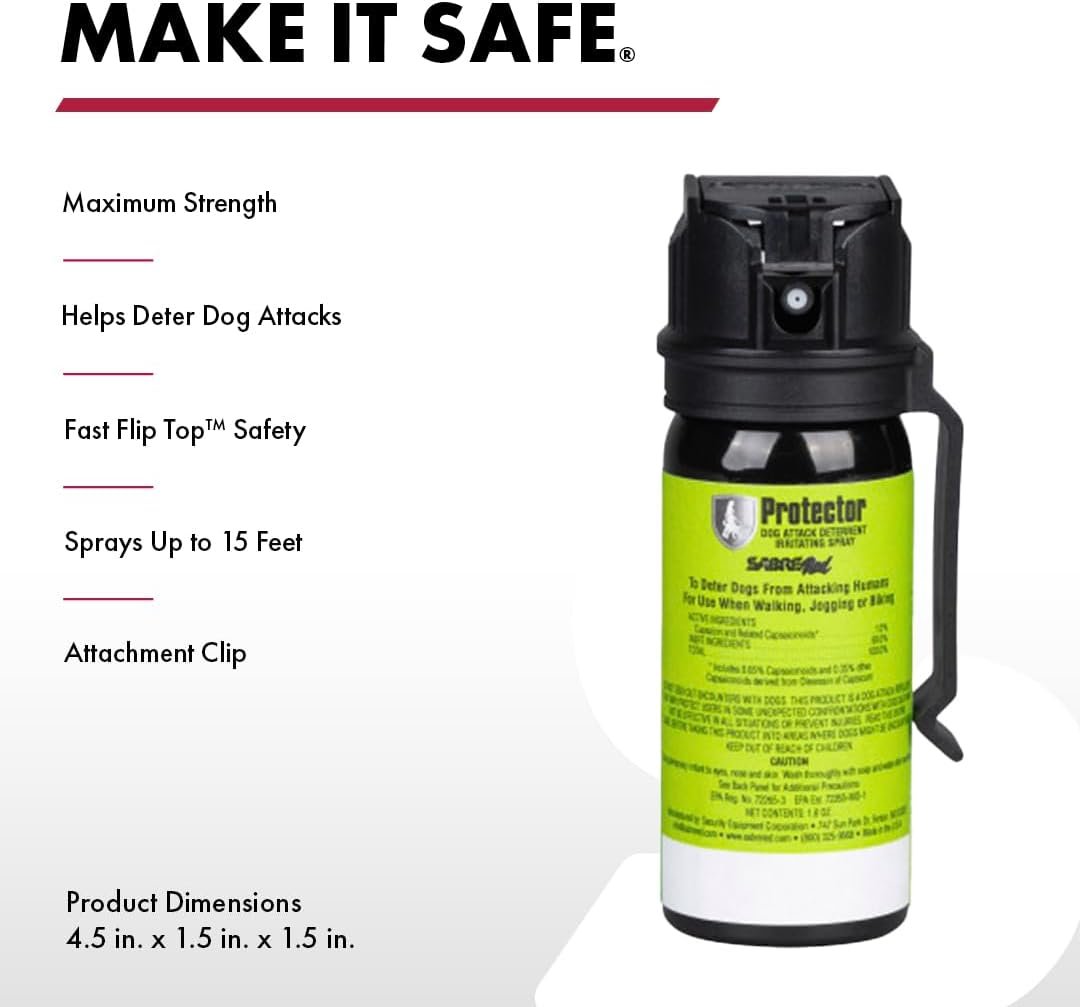 The SABRE RED SABRE Protector Dog Pepper Spray & Belt Clip offers peace of mind with its maximum-strength, EPA-approved formula—trusted by police and consumers alike. This humane, all-natural spray delivers up to 7 bursts with a 15-foot range, providing safe, effective protection against aggressive dogs. Backed by rigorous testing and free safety training, SABRE ensures you're prepared for any situation. Choose SABRE for reliable personal protection and confidence on every walk.
