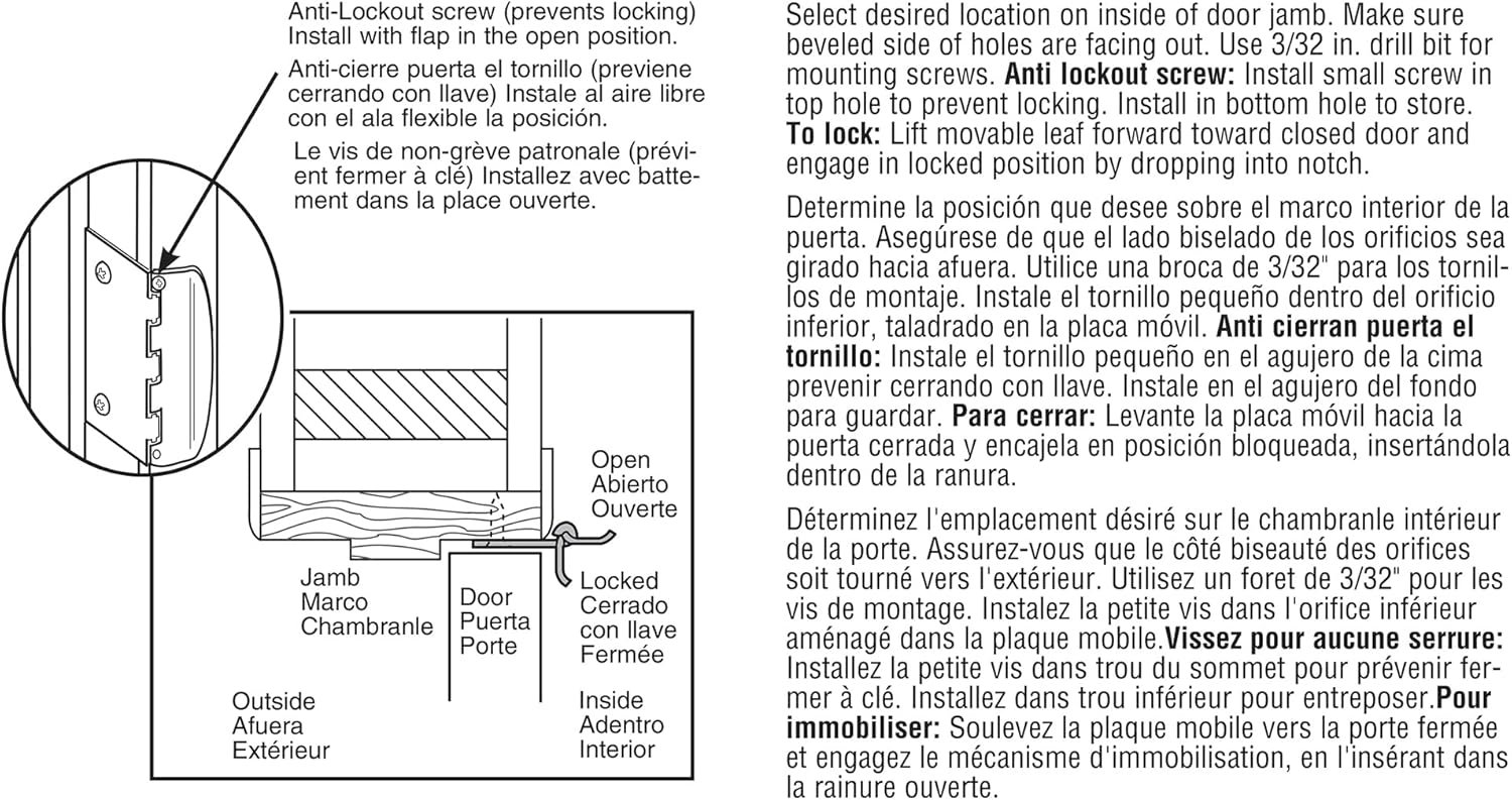 The included anti lock out screw can be used to prevent accidental engagement. Installed high on the door, it helps keep curious kids from flipping it into a locked position.