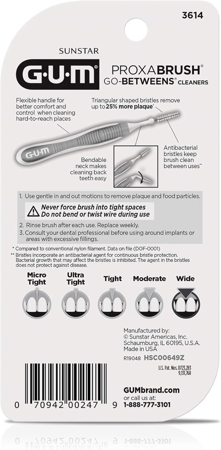Experience superior plaque removal and gum care with the GUM Proxabrush Go-Betweens Wide Interdental Brushes from the GUM Store. Designed with soft, wide bristles, these reusable dental picks are perfect for cleaning larger spaces between teeth and around braces or dental devices. Each brush is compact, travel-ready, and treated for up to ten days of hygienic use. Upgrade your oral care routine with these easy-to-use alternatives to traditional floss and give your gums the healthiest start possible.